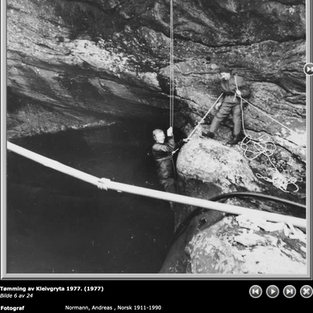 På 70-tallet ble den store jettegryta tømt for vann. Det var 12 meter ned til bunnen. Og enda var de ikke kommet til bunnen. Det var sand og stein som de ikke fikk ut. Den er ganske brei også. De brukte hevert-prinsippet for å få vannet ut av gryta. De tok en slange ned og så rant det av seg selv. Det var Nils Hole, Arne Randers Heen, Bodil Heen og Andreas Normann som stod bak prosjektet, og faren min var med som grunneier. Bildene er fra Normannsamlingen. Klikk på lenken og se flere bilder fra Kleivgrytene.