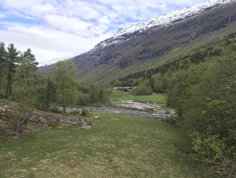 Jeg fant meg en fin stein å hvile ved på jordet. Og Knut gikk videre til neste husmannsplass. Her er det også fin utsikt over til gården Stavem på andre siden av Rauma elv.